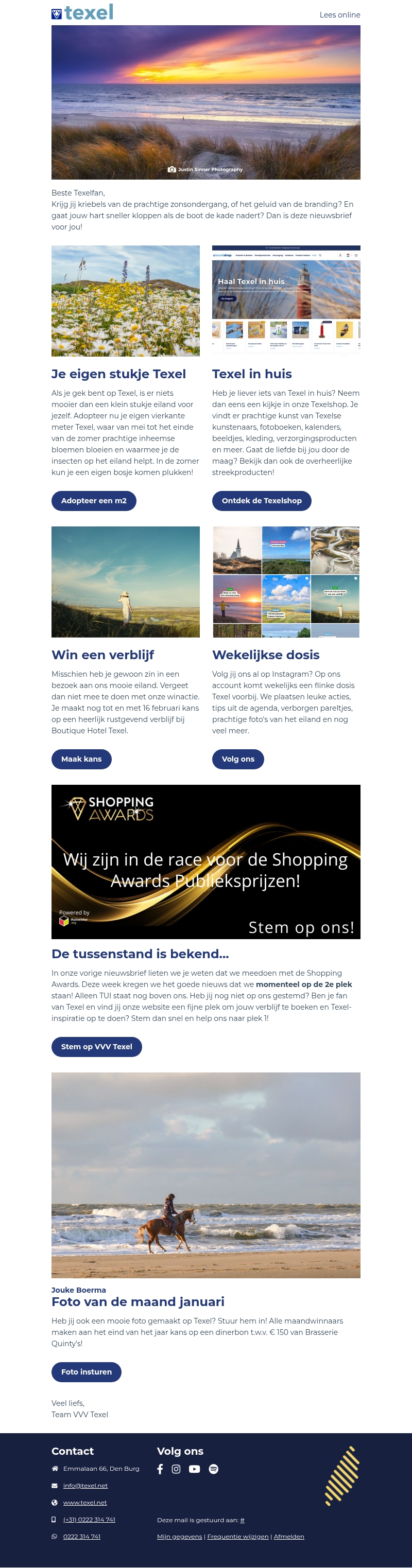 Beleef Texel als nooit tevoren met onze nieuwsbrief. Adopteer je eigen stukje Texel en ontdek de unieke producten in de Texelshop. Vergeet niet mee te doen aan onze wedstrijd voor een verblijf en volg ons op Instagram voor een wekelijkse dosis Texel. Daarnaast zijn we genomineerd voor de Shopping Awards Publieksprijzen!