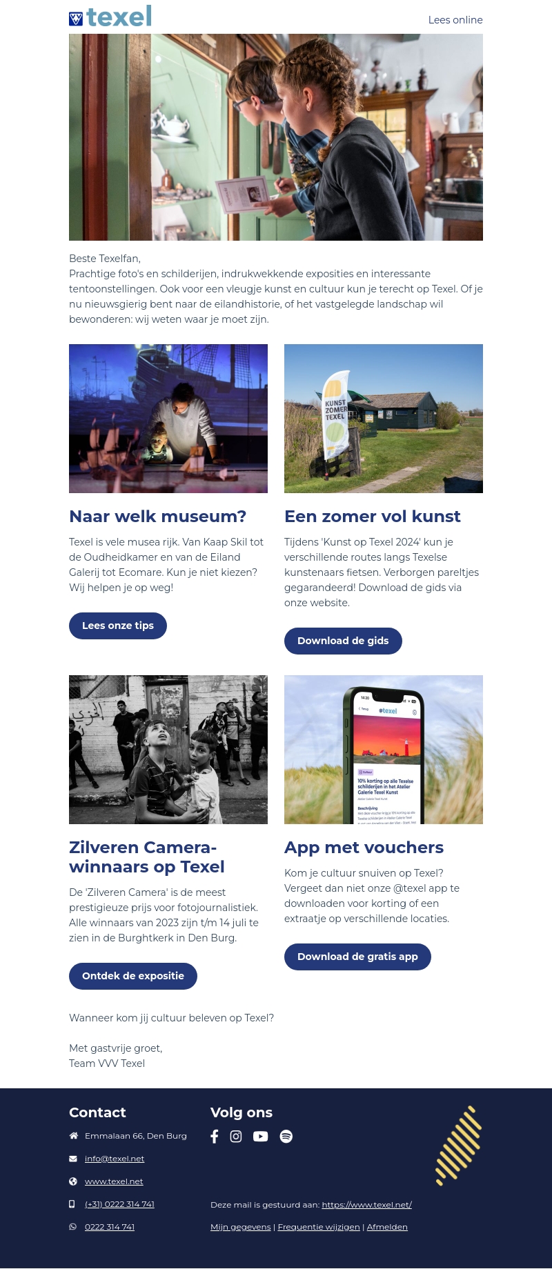 Breng deze zomer een bezoek aan Texel en ontdek de prachtige kunst en cultuur. Van fascinerende musea en indrukwekkende exposities tot fietsroutes langs lokale kunstenaars, Texel heeft het allemaal. Vergeet niet onze app te downloaden voor extra voordelen!