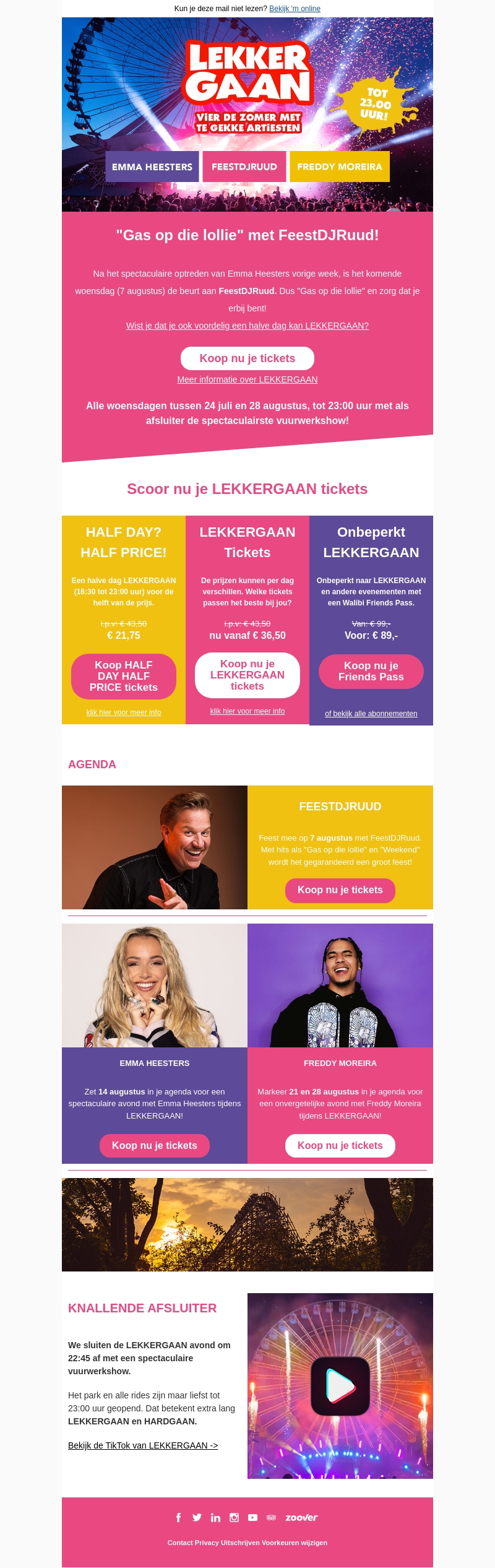 Vier de zomer met spectaculaire optredens bij LEKKERGAAN! FeestDJRuud treedt op 7 augustus op. Haal nu je tickets en geniet van geweldige avonden vol muziek, plezier en vuurwerk. Mis het niet!