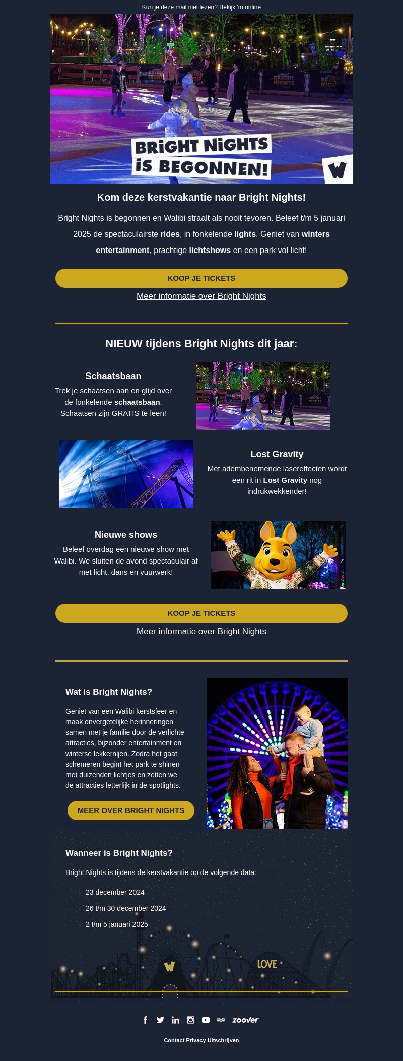 Bright Nights is begonnen en Walibi straalt als nooit tevoren. Geniet van spectaculaire attracties en fonkelende lichtshows. Ervaar de winterse sfeer met gratis schaatsplezier, adembenemende laser effecten, en nieuwe shows vol dans en vuurwerk.