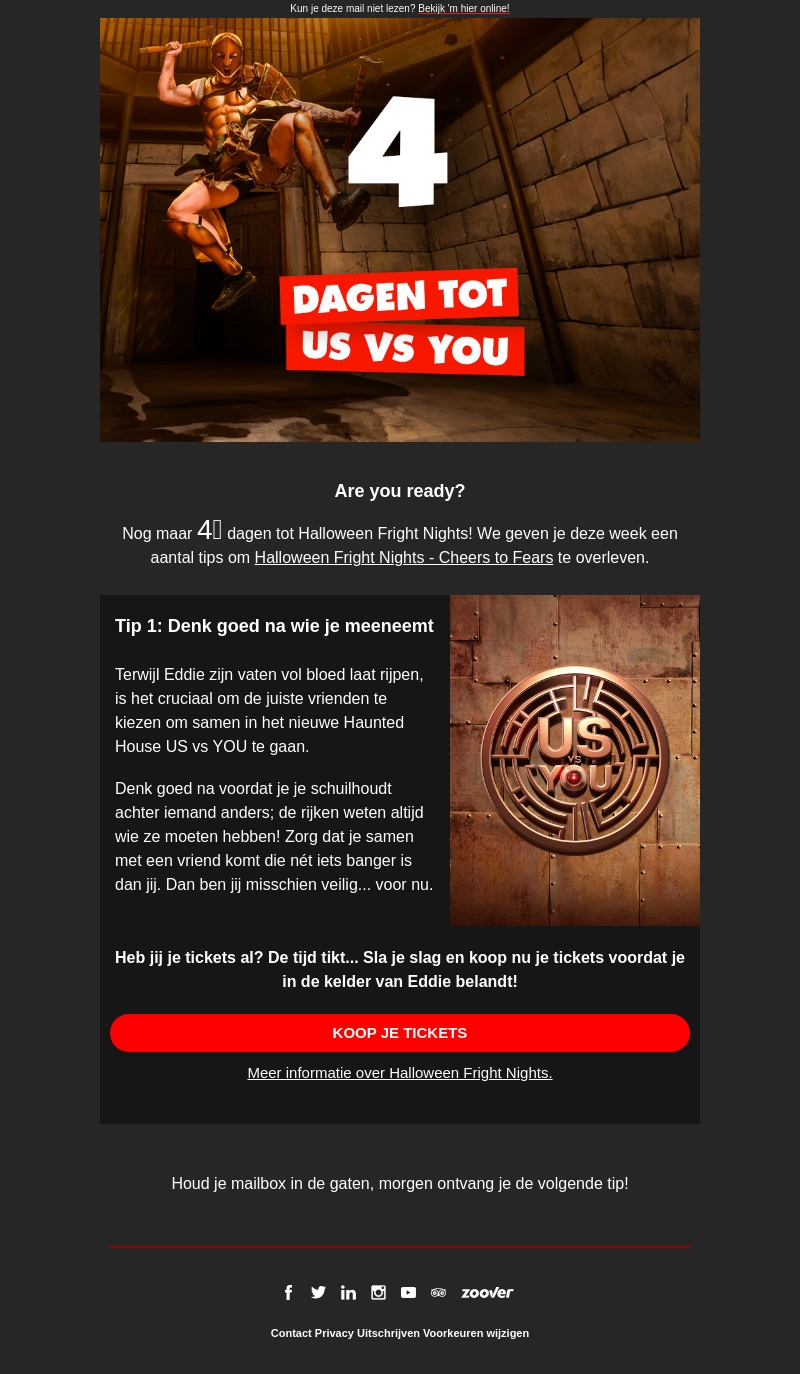 Nog 4 dagen tot de spannende Halloween Fright Nights. Bereid je voor met onze tips en verzeker jezelf van een griezelig goede tijd. Koop je tickets nu om te voorkomen dat je hoofdpersonage Eddie tegenkomt!