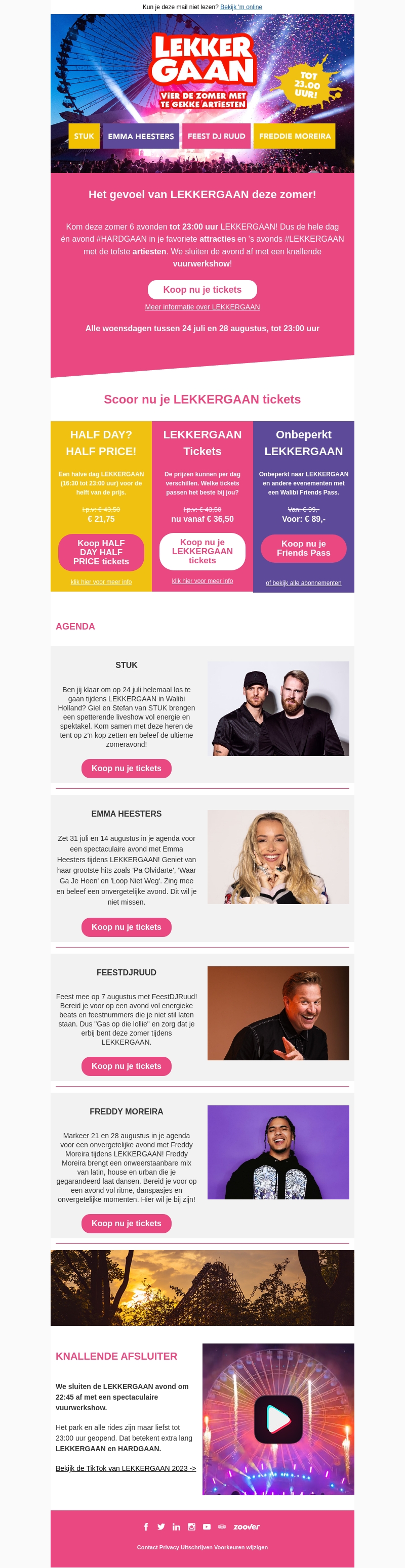 Beleef een onvergetelijke zomer bij LEKKERGAAN met artiesten als Emma Heesters en DJRUUD. Geniet van avondvullende optredens en een knallende vuurwerkshow. Koop nu je tickets en zorg dat je dit niet mist!