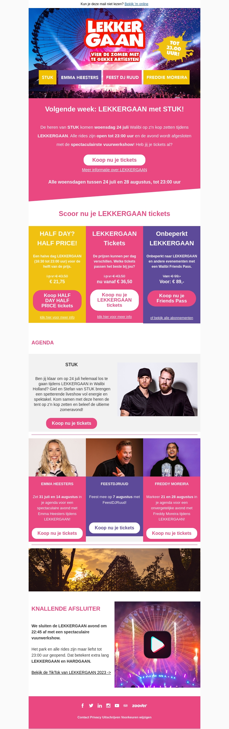 Bereid je voor op een knallende week met STUK bij LEKKERGAAN. Op woensdag 24 juli zetten Giel en Stefan van STUK het park op z'n kop in Walibi Holland. Mis de spectaculaire vuurwerkshow niet. Koop nu je tickets voor een onvergetelijke avond!