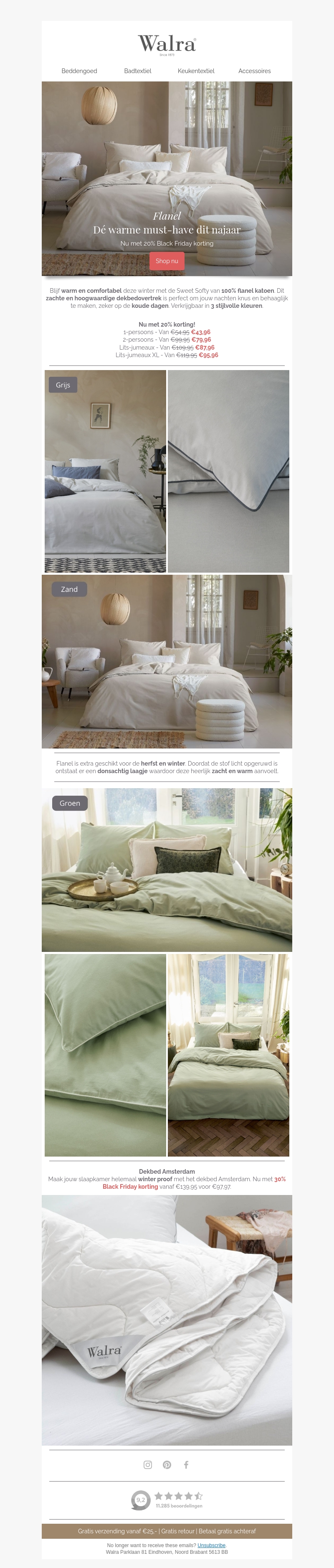 Bereid je voor op de koude nachten met Walra's flanel beddengoed. Geniet van een luxueus zachte slaapervaring met hoogwaardig katoen. Profiteer nu van 20% Black Friday korting op onze populaire dekbedovertrekken en meer. Verkrijgbaar in meerdere kleuren en maten. Geef je slaapkamer een warme, stijlvolle upgrade.