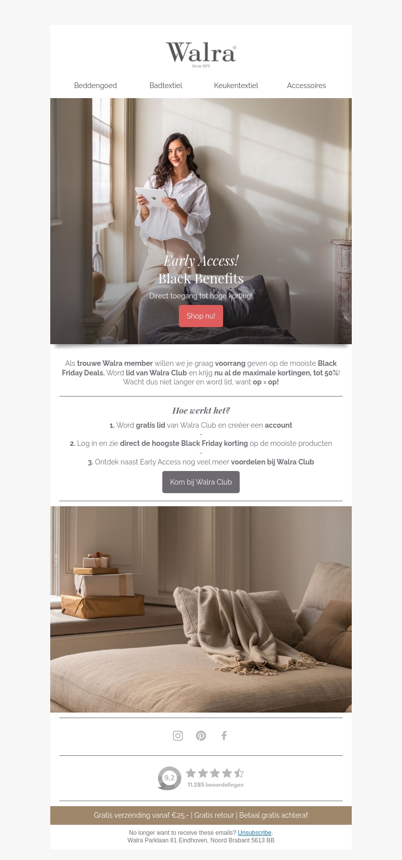 Profiteer van Walra's Early Access kortingen tot 50% op prachtige Black Friday aanbiedingen. Word lid van de Walra Club en krijg onmiddellijke toegang tot deze exclusieve deals. Meld je vandaag nog aan en mis deze kans niet om te besparen op premium artikelen. Shop nu en ontdek de unieke voordelen van Walra.