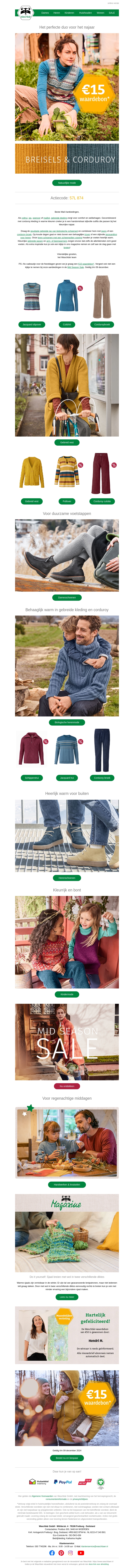Ontvang een cadeautje van €15 en vernieuw je garderobe met de nieuwste collectie gebreide en corduroy kleding. Profiteer van warme truien, stijlvolle vesten en comfortabele broeken perfect voor het najaar. Mis deze kans niet en maak gebruik van de aanbieding voor een extra korting.