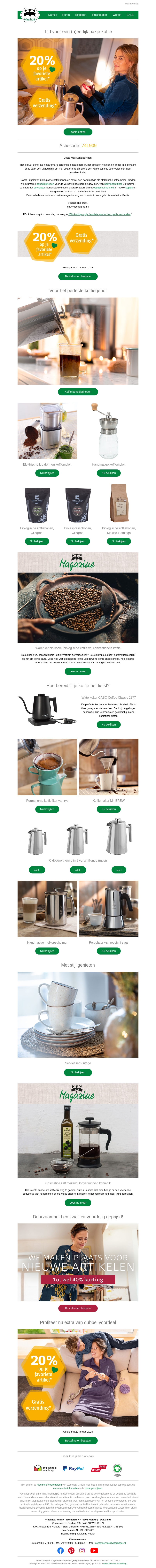 Profiteer van 20% korting op je favoriete koffieproducten en geniet van gratis verzending. Verken ons assortiment duurzame koffiebenodigdheden en ontdek hoe je thuis de perfecte kop koffie zet. Mis deze kans niet om te besparen en te genieten van hoogwaardige smaken bij jou thuis.