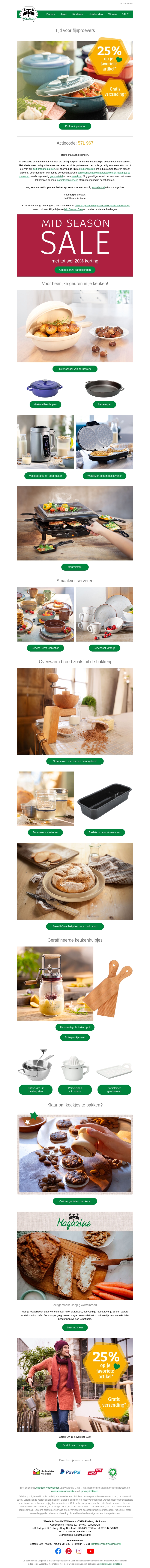 Mis deze geweldige kans niet! Krijg 25% korting op je favoriete producten voor de herfst en geniet van gratis verzending. De Mid Season Sale is de perfecte gelegenheid om je keukenuitrusting te vernieuwen en van het seizoen te genieten.
