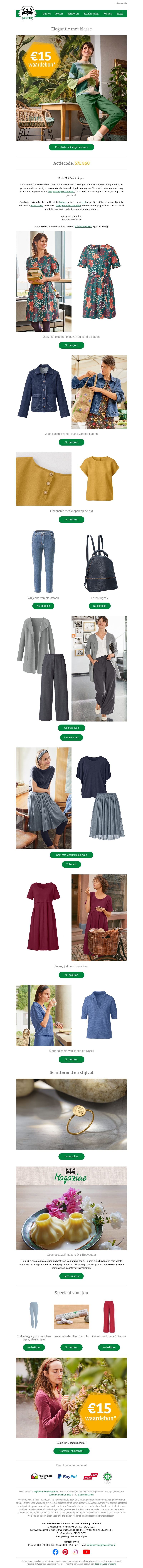 Ontvang een gratis €15-waardebon bij je volgende aankoop. Onze nieuwsbrief presenteert een selectie van modieuze kledingstukken en accessoires die je niet wilt missen. Profiteer van ongelooflijke besparingen en vernieuw je garderobe vandaag nog. Bekijk nu de nieuwste trends en geniet van extra kortingen. Mis deze kans niet!