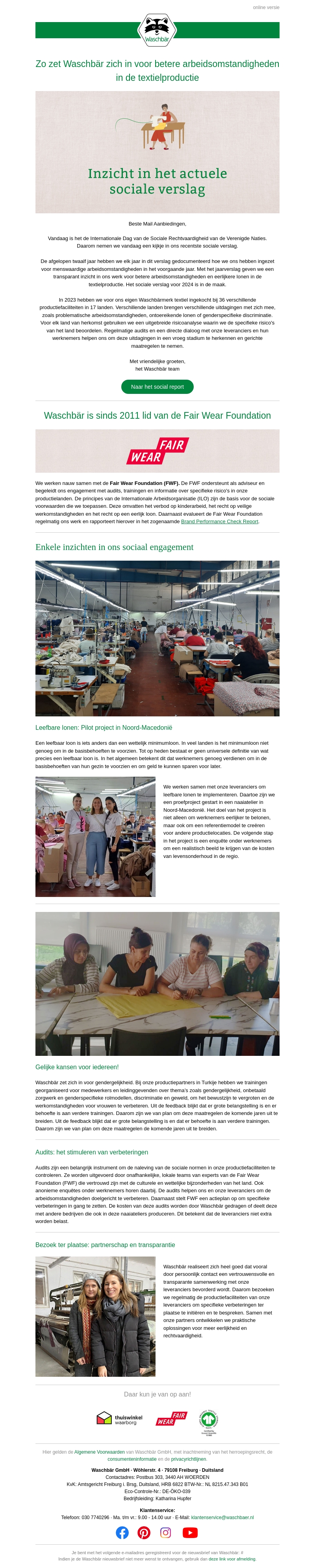 Waschbär zet zich in voor betere arbeidsomstandigheden in de textielproductie. Op de Werelddag van Sociale Rechtvaardigheid deelt Waschbär hun inspanningen voor sociale verbeteringen binnen hun productieprocessen. Al sinds 2011 werken ze samen met de Fair Wear Foundation om transparante en eerlijke werkomstandigheden te waarborgen.