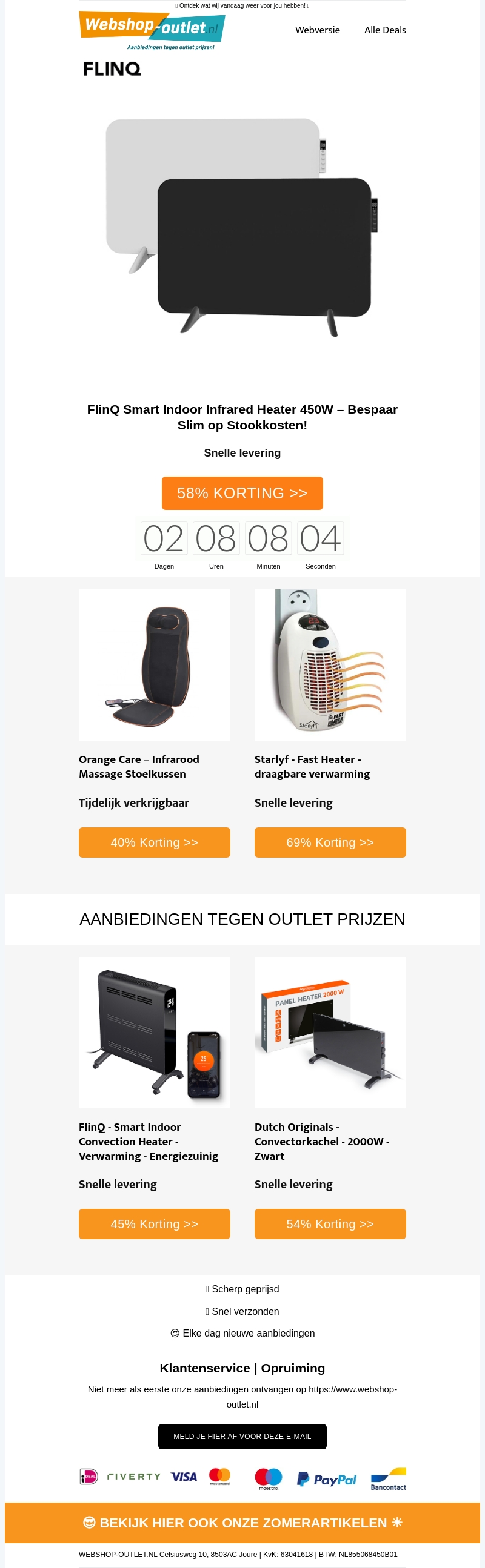 Bespaar slim op stookkosten met de FlinQ Smart Indoor Infrarood Heater 450W. Profiteer van 58% korting en ontdek ook andere topdeals zoals infrarode massagestoelkussens en draagbare verwarmers. Snel geleverd en voordelig geprijsd bij Webshop Outlet. Mis deze geweldige aanbiedingen niet en maak je huis klaar voor de kou.