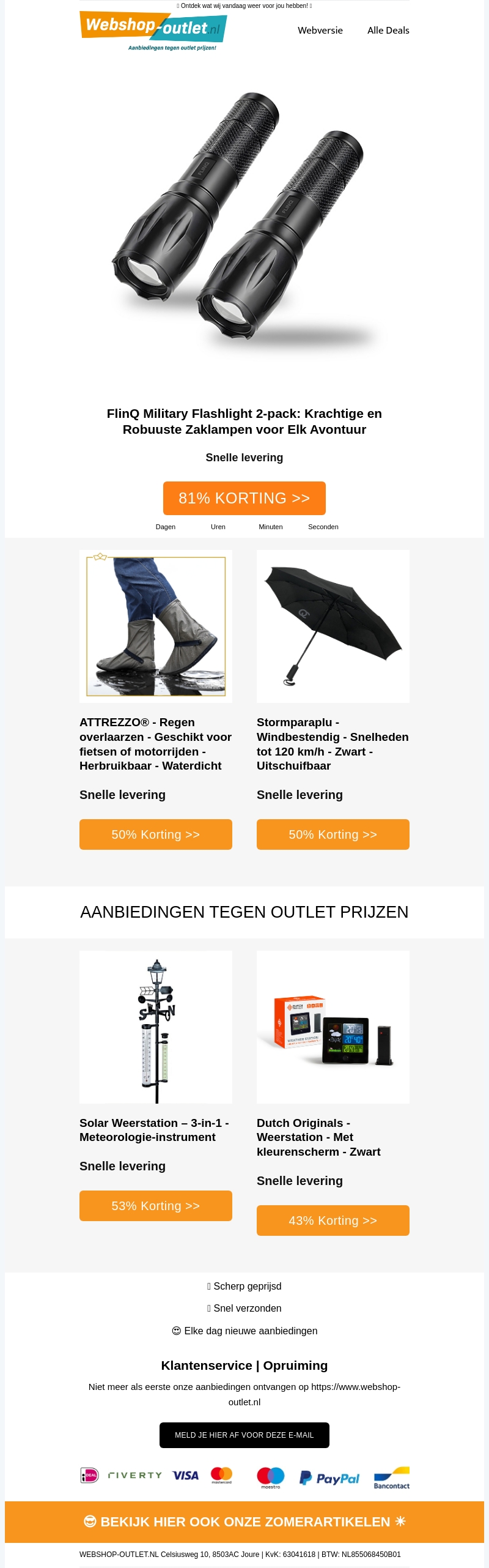 Ontdek de Orkaan Sale bij Webshop-outlet.nl met ongelooflijke kortingen tot wel 81%. Van krachtige zaklampen tot praktische regenoverlaarzen en weerstations, er is voor ieder wat wils. Zorg ervoor dat je deze aanbiedingen niet mist en profiteer van snelle levering. Bezoek vandaag nog en ontdek het uitgebreide assortiment aan outletprijzen.