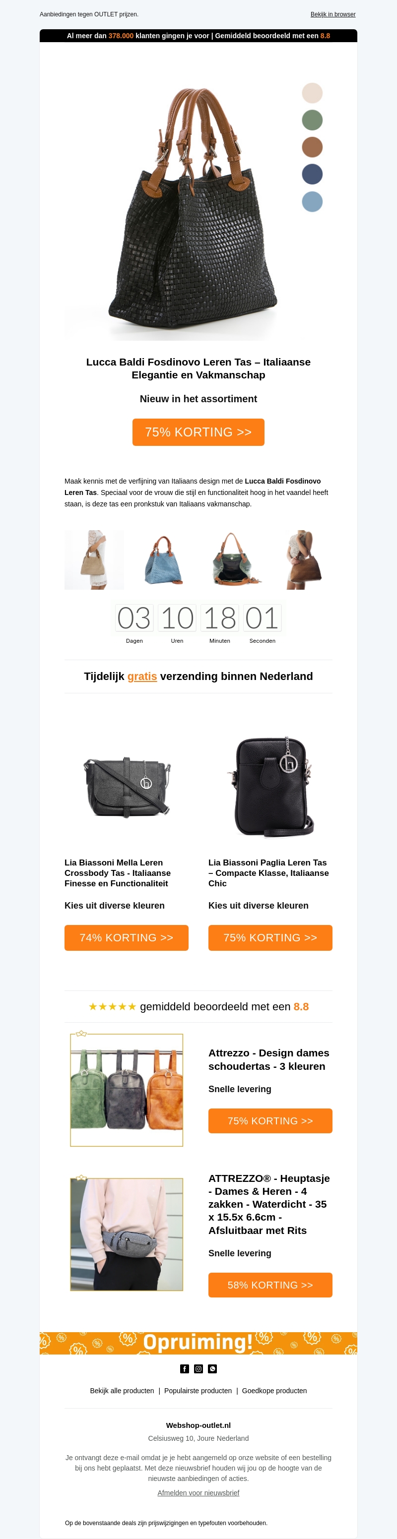 Duik in de wereld van luxe met onze Italiaanse leren tassen, nu met kortingen tot wel 75%. Van de verfijnde Lucca Baldi Fosdinovo tas tot de compacte Lia Biassoni Paglia, er is voor ieder wat wils. Mis deze kans niet om stijlvolle tassen met vakmanschap aan uw collectie toe te voegen. Profiteer tijdelijk van gratis verzending binnen Nederland.