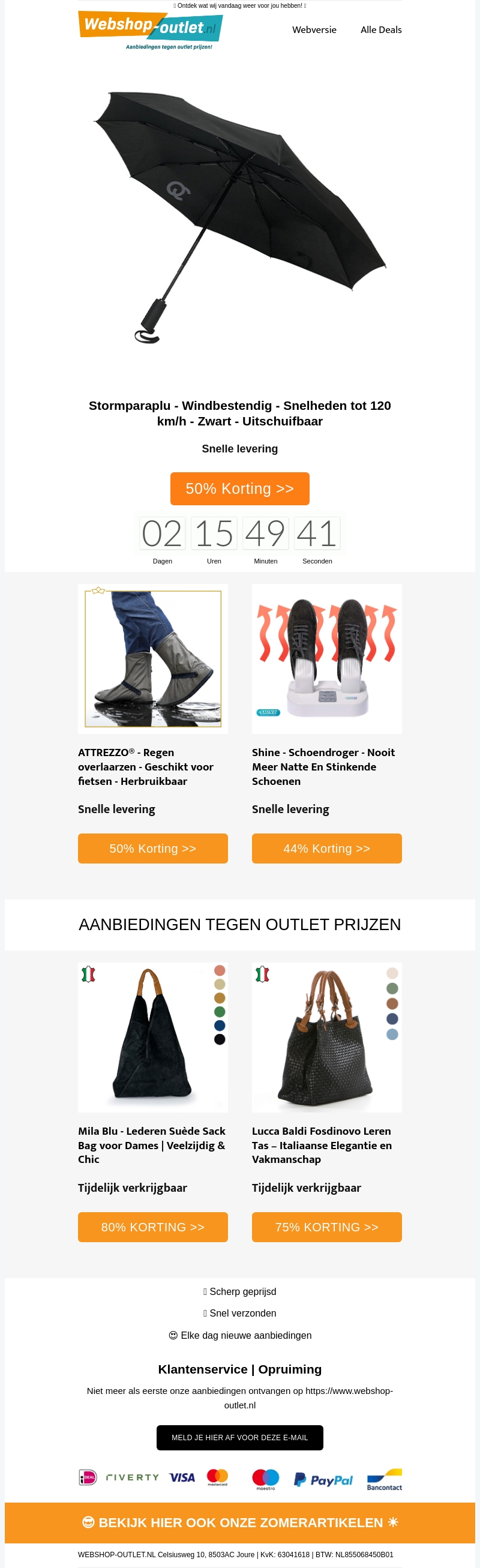 Mis deze geweldige aanbiedingen niet! Ontdek onze stormparaplu's, regenoverlaarzen en schoenendrogers die perfect zijn voor regenachtige dagen. Geniet van kortingen tot 80% en snelle levering. Haast je, de aanbiedingen gelden tijdelijk.