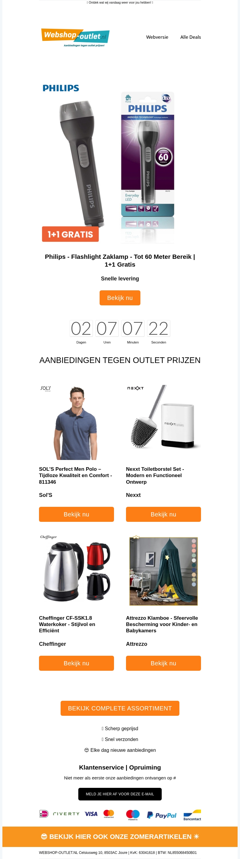 1+1 Zaklampactie Philips / Klamboe voor de Kinderkamer / Moderne Toiletborstel / Waterkoker Cheffinger / Polo's van Sol'S