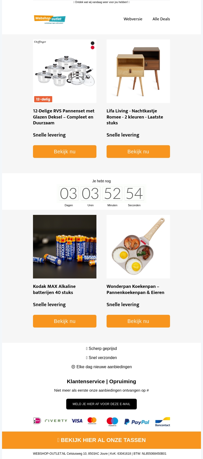 Deze week biedt Webshop Outlet spannende kortingen op een 12-delige Cheffinger pannenset, Lifa Living nachtkastjes, Kodak batterijen en een multifunctionele Wonderpan. Profiteer van snelle levering bij al uw aankopen. Mis deze exclusieve deals niet en verbeter uw keuken en huis met hoogwaardige producten.