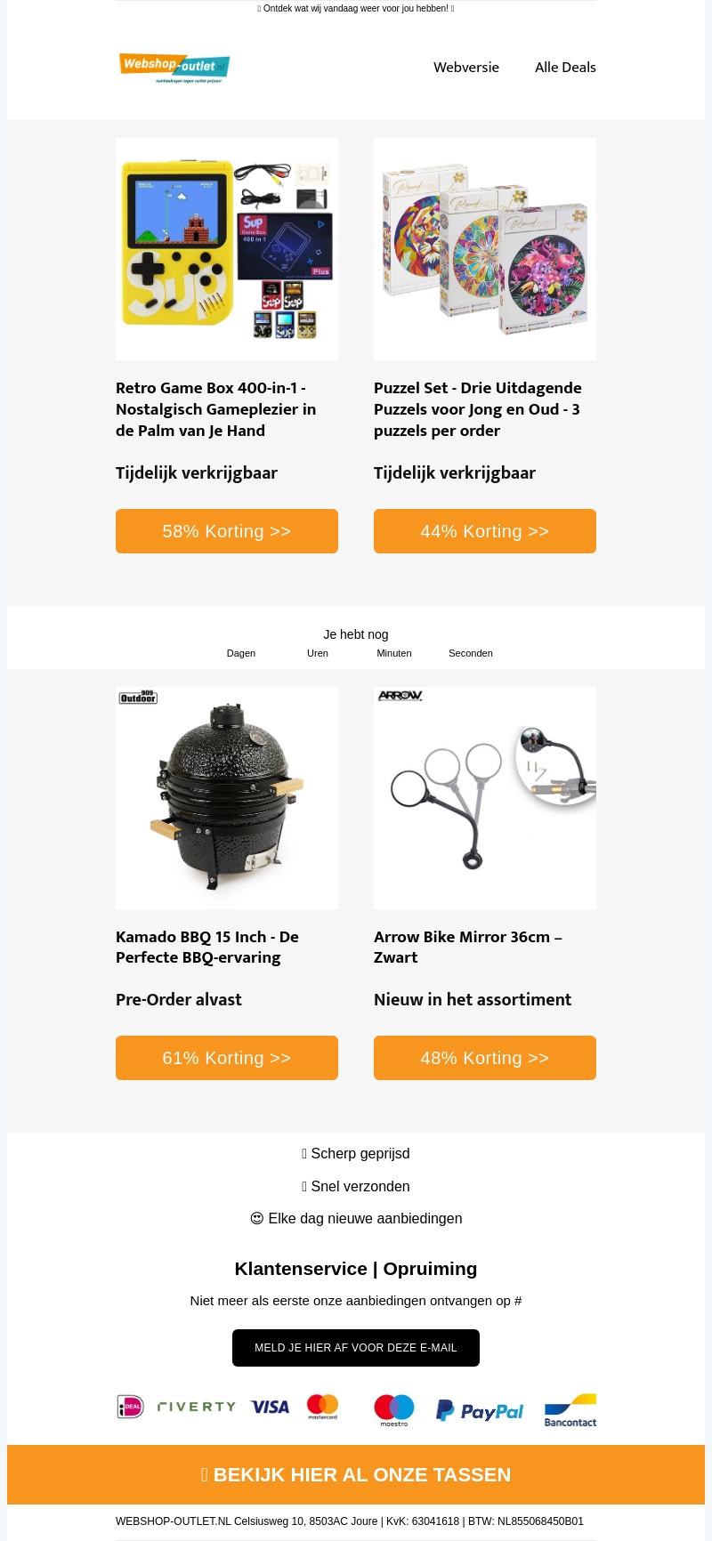 Bezoek onze webshop voor ongelofelijke deals op puzzelsets en retro game consoles. Geniet van nostalgisch gameplezier met de Retro Game Box 400-in-1. Voor puzzelaars zijn er drie uitdagende sets beschikbaar. Mis ook de pre-order kans voor een Kamado BBQ en onze nieuwe fietsspiegel. Snel inslaan en besparen!
