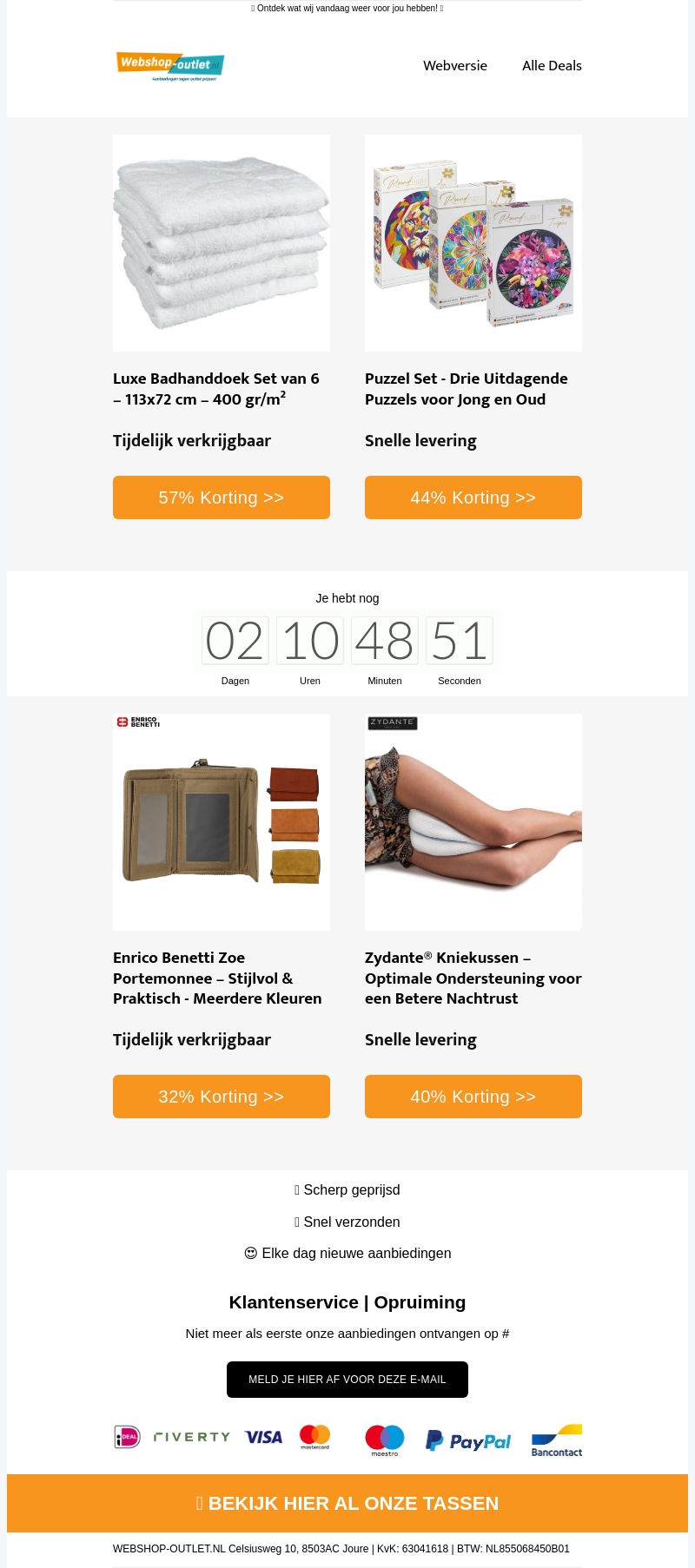 Verwen jezelf met onze luxe badhanddoekenset, perfect voor een ontspannend badmoment. Daag je geest uit met onze set van drie prachtige puzzels, geschikt voor jong en oud. Mis ook niet onze Enrico Benetti portemonnee in diverse kleuren, stijlvol en praktisch. Voor een betere nachtrust bieden we het Zydante kniekussen voor optimale ondersteuning. Profiteer nu van flinke kortingen!