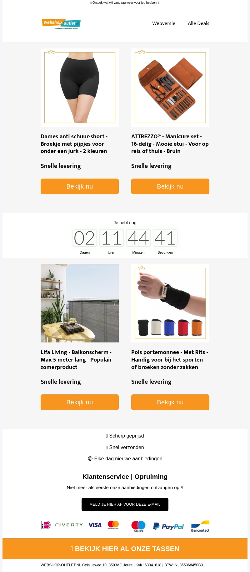 Deze nieuwsbrief biedt een aantrekkelijke selectie van praktische items zoals het dames anti-schuurbroekje en een uitgebreide manicure set. Ontdek ook het handige balkonscherm van Lifa Living en de sportieve pols portemonnee. Perfect voor veelzijdig gebruik en snelle levering gegarandeerd. Mis deze unieke aanbiedingen niet!