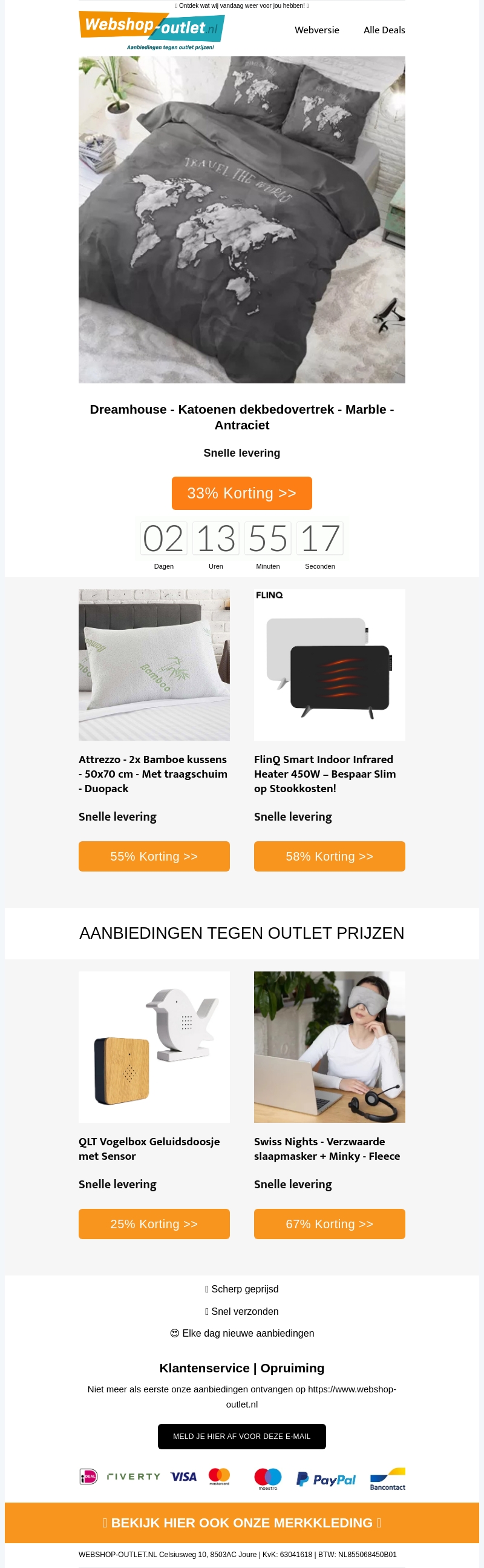 Profiteer van onze fantastische kortingen op Dreamhouse katoenen dekbedovertrekken, Attrezzo bamboe kussens en meer. Haal het beste uit je slaapervaring met onze high-quality producten. Snelle levering en outlet prijzen zorgen voor een voordelige deal. Mis de kans niet om te besparen op je favoriete artikelen.