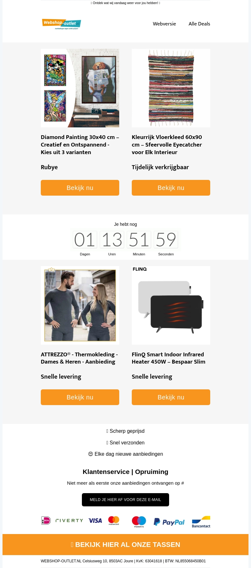 Ontdek onze huidige aanbiedingen, waaronder drie varianten diamond paintings voor een creatieve ontspanning en kleurrijke vloerkleden voor elk interieur. Daarnaast bieden we thermokleding aan voor zowel dames als heren en slimme verwarmingsoplossingen met de FlinQ heater. Shop nu en breng kleur en warmte in huis!
