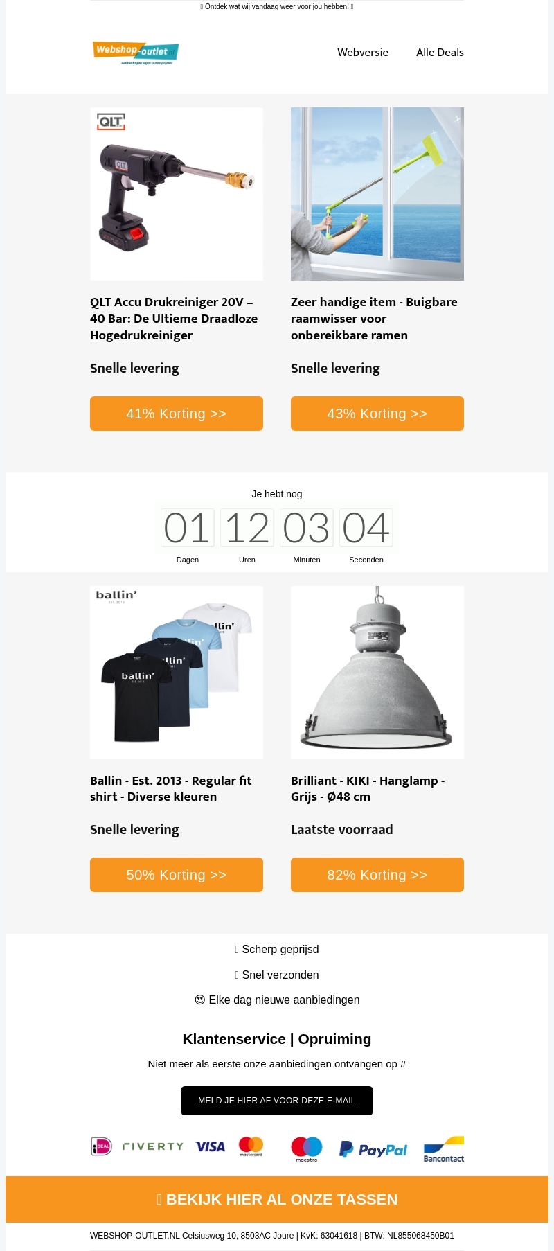 Bezoek onze nieuwsbrief voor exclusieve kortingen op een draadloze hogedrukreiniger, een buigbare raamwisser, stijlvolle Ballin T-shirts en de elegante Kiki hanglamp. Deze producten bieden praktische oplossingen en trendy stijl voor elke situatie. Mis deze geweldige aanbiedingen niet!