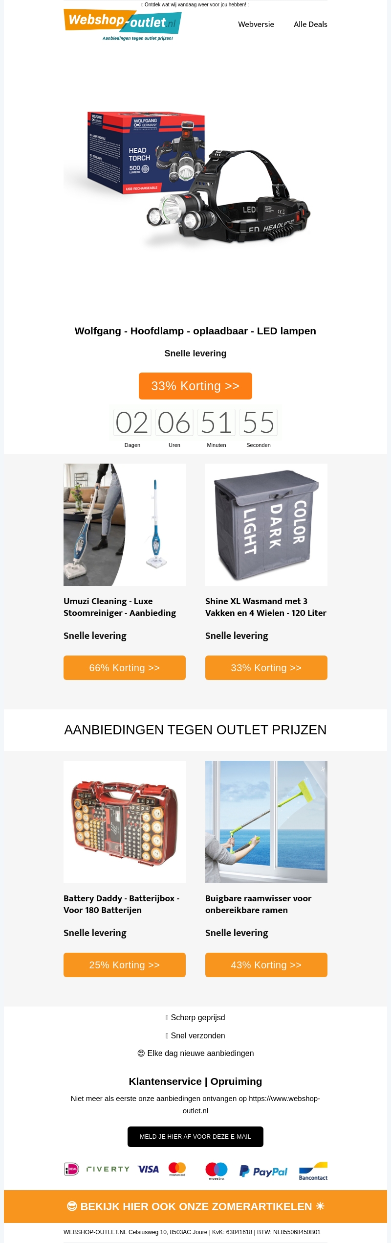 Profiteer van de beste deals op Webshop-outlet.nl! Ontvang 33% korting op de Wolfgang Hoofdlamp, geniet van snelle levering op de Shine XL Wasmand, en ontdek de luxe stoomreiniger van Umuzi Cleaning. Mis ook de aanbiedingen tegen outlet prijzen niet, zoals de handige batterijbox en buigzame raamwisser.