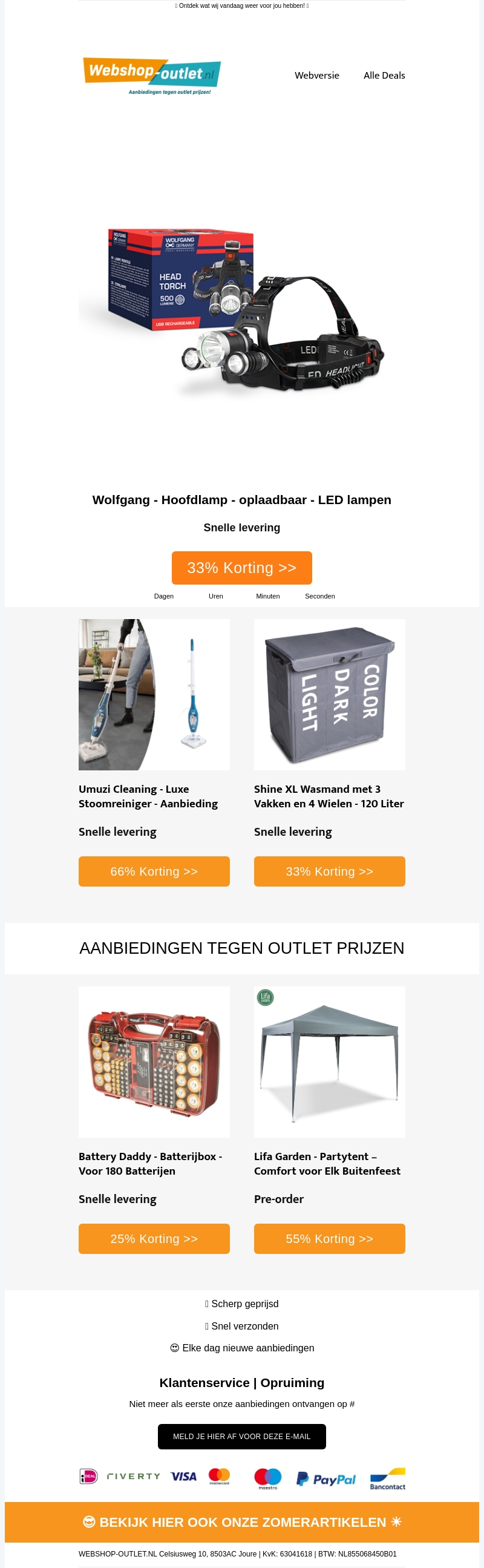 Geniet van geweldige kortingen op onze Wolfgang hoofdlamp, Shine XL wasmand met 3 vakken en de luxe Umuzi stoomreiniger. Ideaal voor efficiรซnte huishoudelijke taken en meer. Bekijk snel onze aanbiedingen en mis de hoogste kortingen niet.