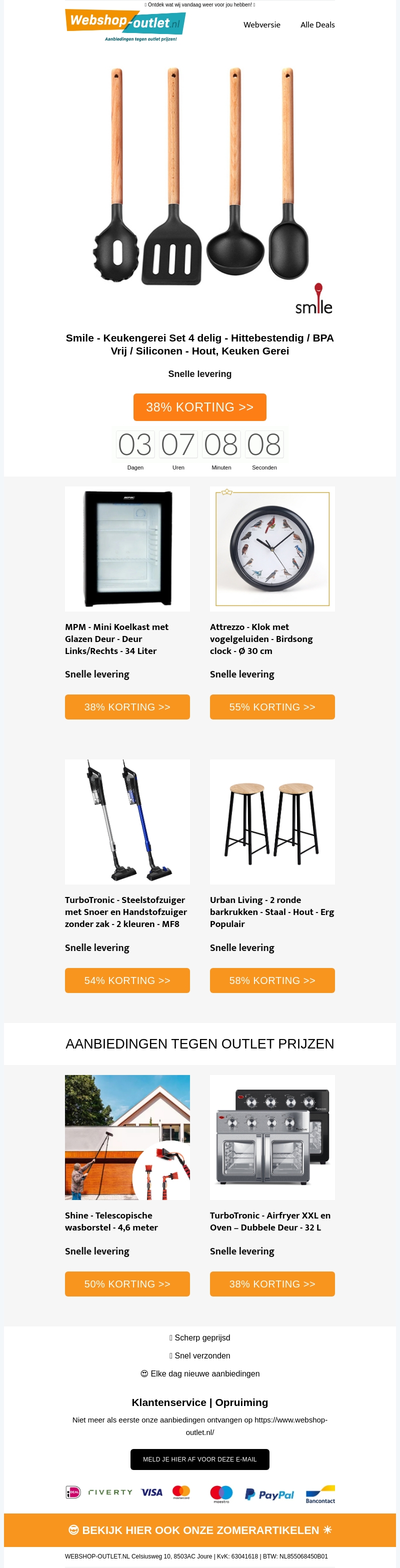 Mis deze geweldige kortingen niet! Ontvang 38% korting op een keukengerei set van Smile, 38% korting op een mini koelkast van MPM, en 55% korting op een klok met vogelgeluiden van Attrezzo. Daarnaast bieden we ook kortingen op een TurboTronic stofzuiger en een 2-in-1 airfryer-oven.