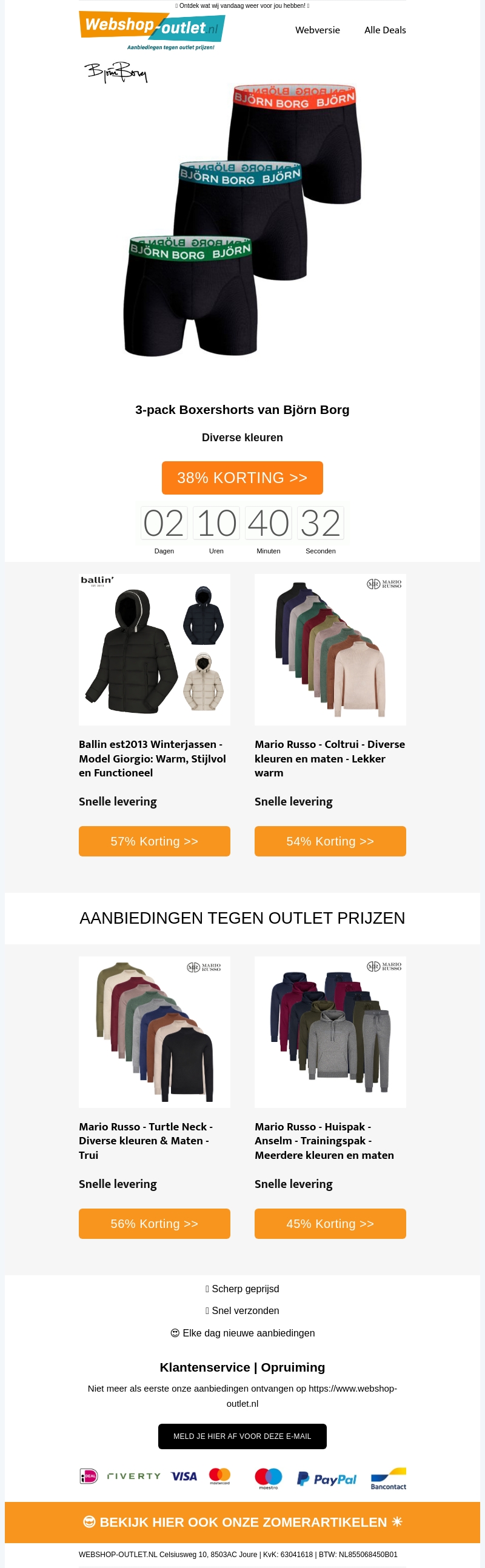 Bespaar groot op stijlvolle merkkleding met onze outletdeals. Krijg 38% korting op Björn Borg boxershorts en 57% korting op warme Ballin winterjassen. Mario Russo coltruien en traininspakken zijn ook scherp geprijsd. Profiteer van snelle levering en dagelijkse nieuwe aanbiedingen bij Webshop Outlet.