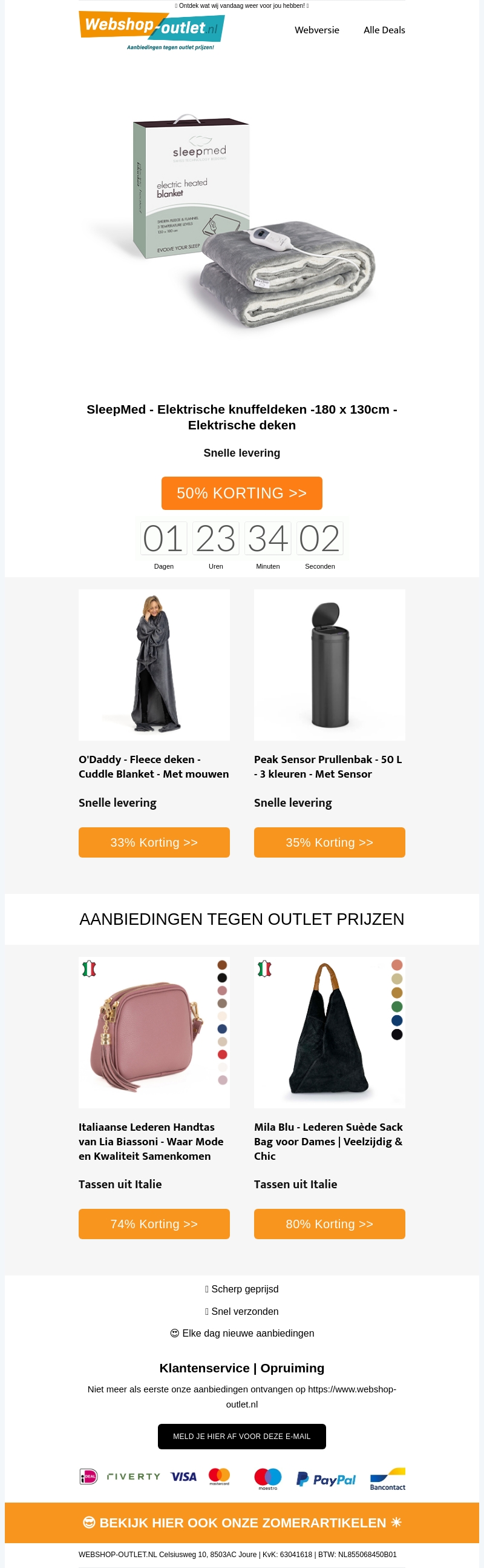 Deze nieuwsbrief presenteert u een exclusieve kans om te besparen op onze geweldige producten. Geniet van maar liefst 50% korting op onze SleepMed elektrische knuffeldekens. Daarnaast bieden we een ruime selectie aan mode met Italiaanse handtassen met aantrekkelijke kortingen tot 80%. Vanaf comfortabele dekens tot stijlvolle prullenbakken, het is de ideale tijd om voordelig in te slaan. Mis deze unieke aanbieding niet, want voorraad is beperkt. Snelle levering gegarandeerd!