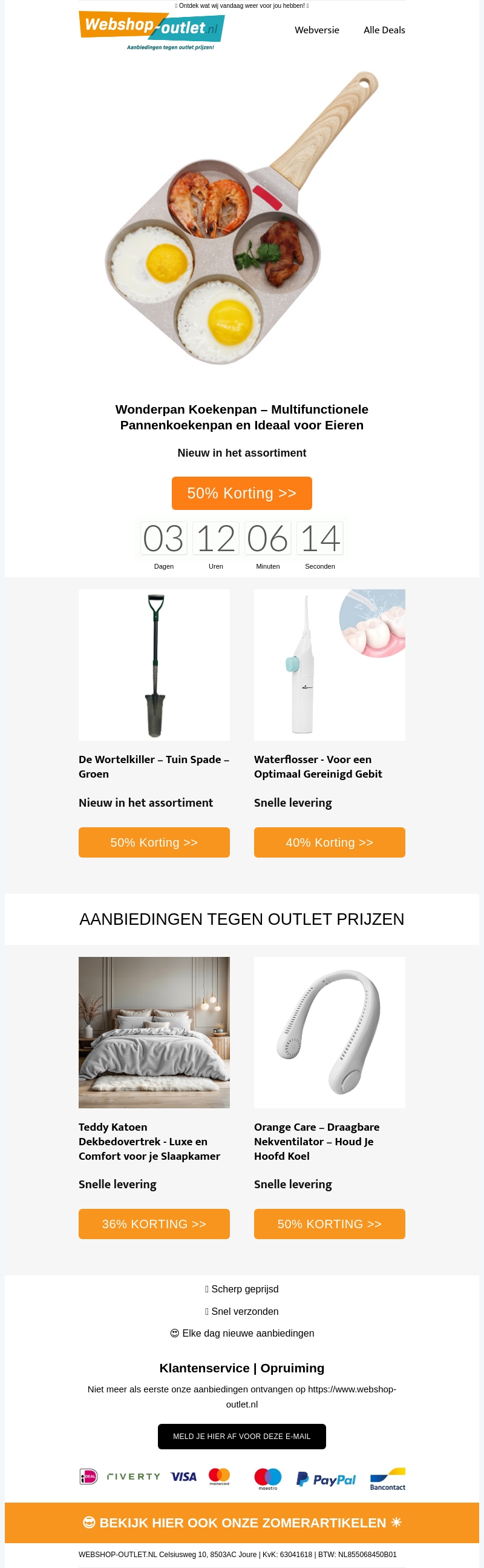 Geniet van geweldige kortingen op onze nieuwste producten bij webshop-outlet.nl. Ontdek de multifunctionele koekenpan, ideale wortelschep, efficiรซnte waterflosser, comfortabel teddy dekbedovertrek en handige nekventilator. Profiteer nu van kortingen tot wel 50% op deze fantastische items.