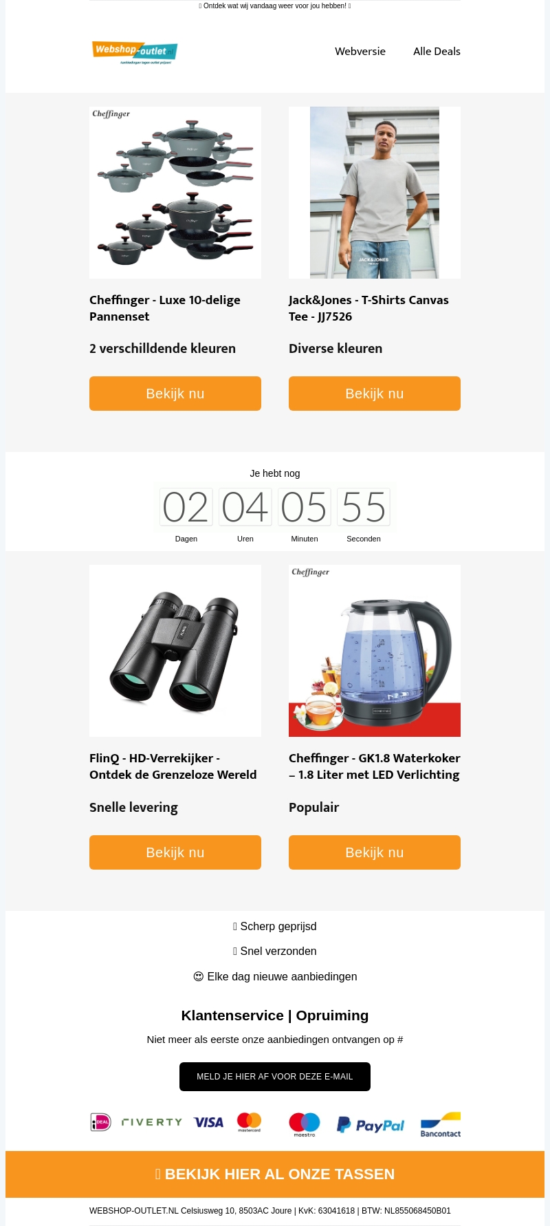 Bezoek onze website voor de laatste aanbiedingen op een luxe 10-delige pannenset van Cheffinger, comfortabele T-shirts van Jack & Jones, een HD-verrekijker van FlinQ en een stijlvolle waterkoker van Cheffinger. Profiteer van scherpe prijzen en snelle levering. Kom snel kijken en haal je favorieten in huis.