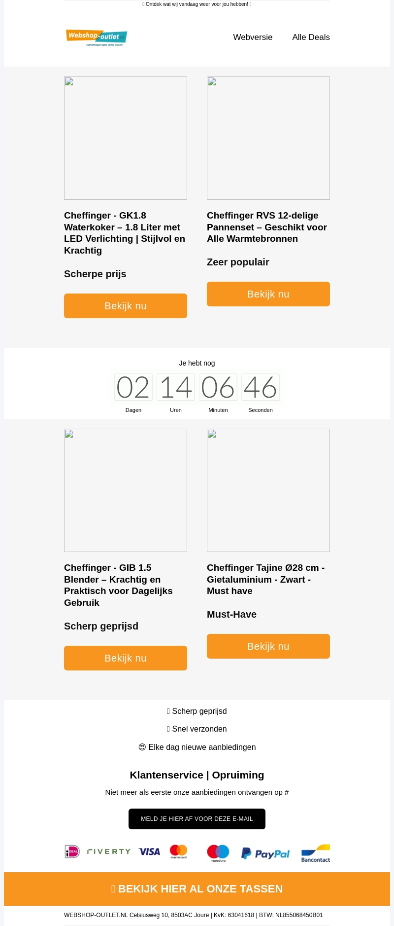 Webshop-Outlet biedt luxe kookgerei zonder hoge prijzen. Ontdek de Cheffinger waterkoker met LED verlichting en de populaire RVS pannenset. Ook verkrijgbaar zijn een krachtige blender en een must-have tajine. Profiteer nu van scherp geprijsde aanbiedingen.