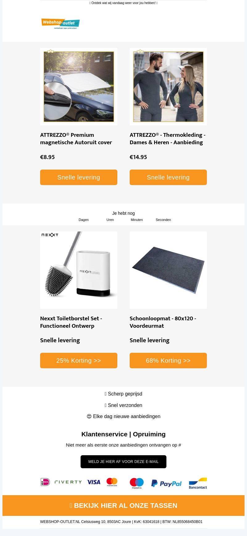 Verken onze nieuwste aanbiedingen, waaronder een premium magnetische autoruitcover en thermokleding voor zowel dames als heren. Deze producten zijn scherp geprijsd en bieden snelle levering. Mis ook onze Nexxt toiletborstel set en voordeurmat niet, met kortingen tot wel 68%.
