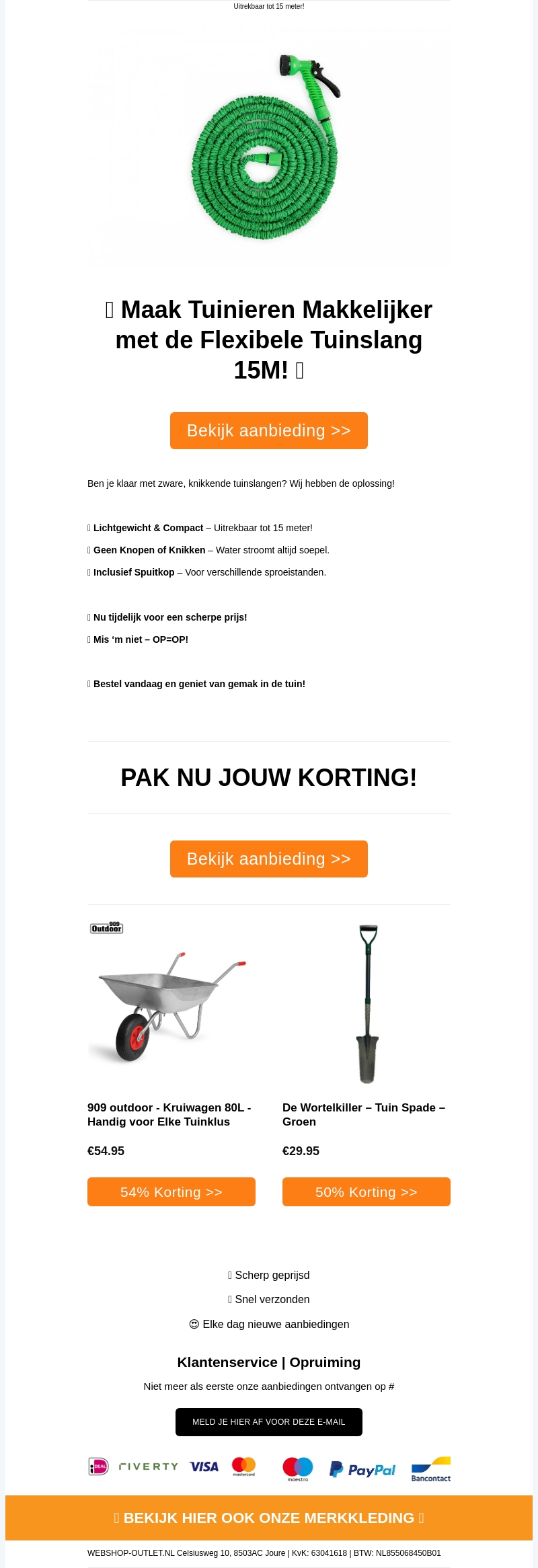 Maak tuinieren makkelijker met onze flexibele tuinslang van 15 meter. Lichtgewicht en compact, ideaal voor elke tuin. Geen knopen, altijd soepele waterstroom. Inclusief spuitkop voor verschillende sproeistanden. Tijdelijk verkrijgbaar voor een scherpe prijs. Mis het niet!