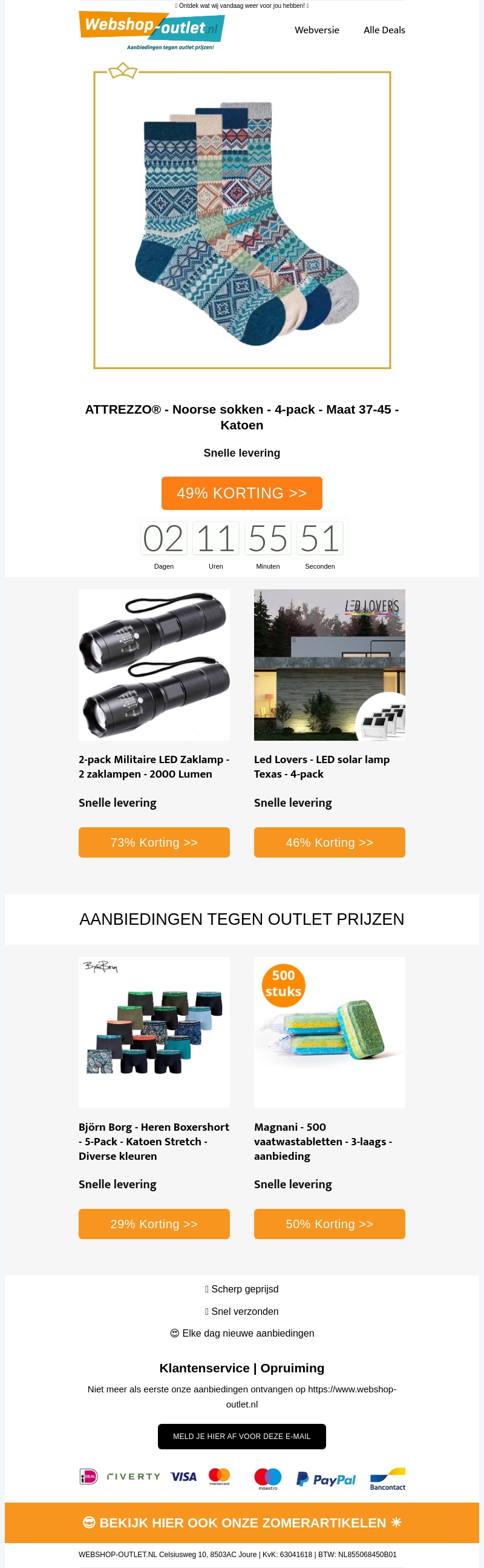 Profiteer van grote kortingen op een breed scala aan producten zoals Noorse sokken, militaire LED-zaklampen, en Björn Borg boxershorts. Haal meer dan 49% korting op je favoriete items en geniet van snelle levering. We hebben ook speciale deals op vaatwastabletten en buitenverlichting.