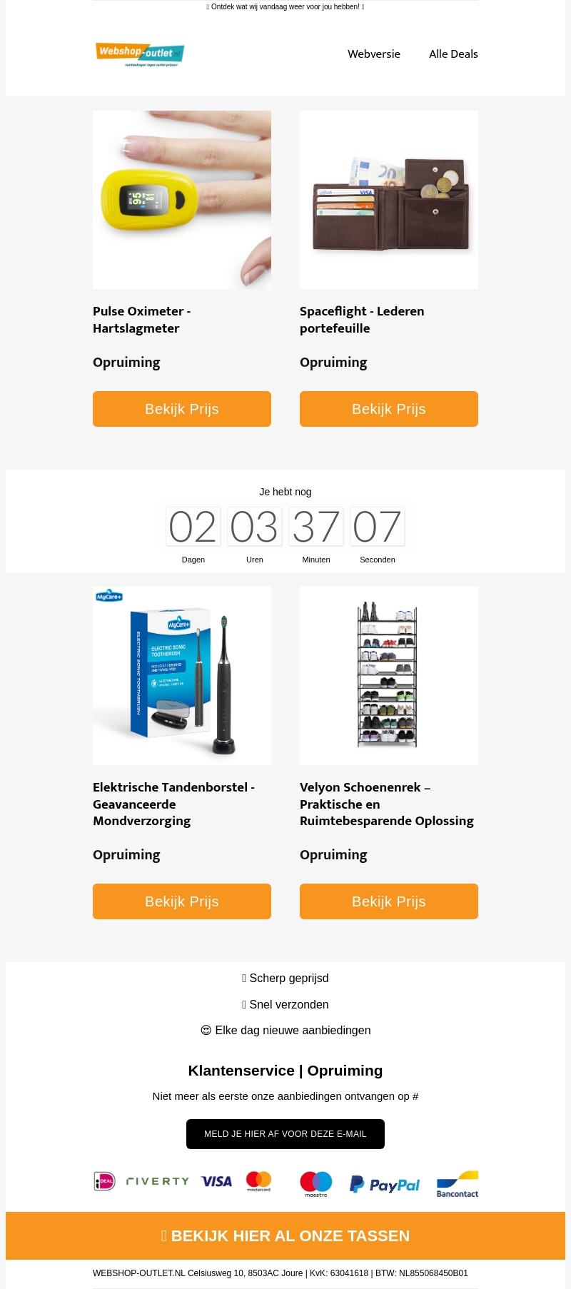 Profiteer van geweldige kortingen tijdens onze opruimingsverkoop. Ontvang een Pulse Oximeter voor nauwkeurige metingen, een stijlvolle leren portefeuille, een geavanceerde elektrische tandenborstel voor effectieve mondverzorging, en een ruimtebesparend schoenenrek. Deze deals zijn tijdelijk, dus sla snel je slag!