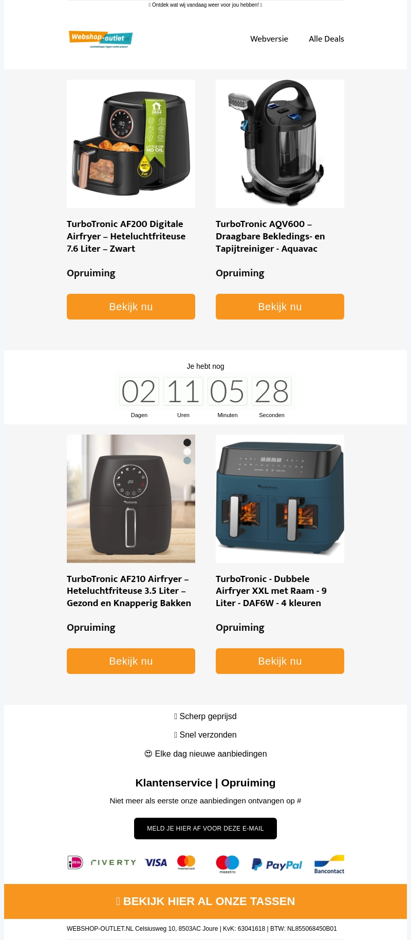 Profiteer nu van de grote opruiming op TurboTronic keukenapparatuur. Van heteluchtfriteuses tot tapijtreinigers, er is voor ieder wat wils. Grijp je kans om premium apparatuur tegen een gereduceerde prijs aan te schaffen. Let op, voorraad is beperkt en de tijd tikt! Mis deze kans niet om je keuken te upgraden. Bekijk de aanbiedingen direct!