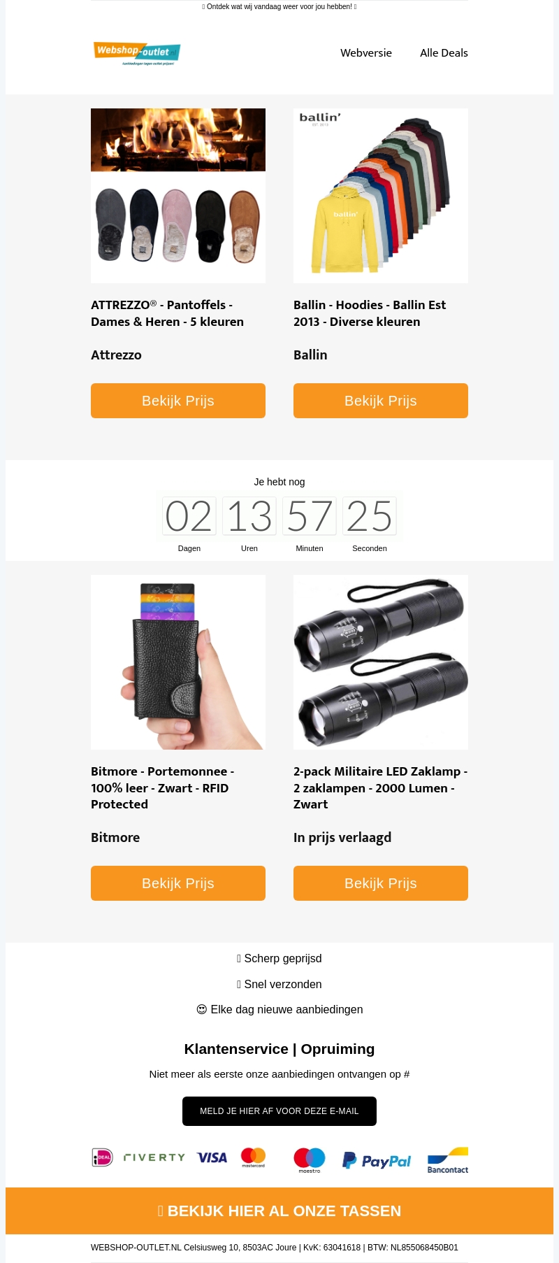 Duik in comfort en stijl met onze nieuwste producten! Geniet van warme pantoffels van Attrezzo en de iconische Ballin truien in verschillende kleuren. Maak je outdoor avonturen veiliger met onze militaire zaklampen en ervaar gemak met de Bitmore portemonnee. Bezoek nu onze deals en bespaar groots.