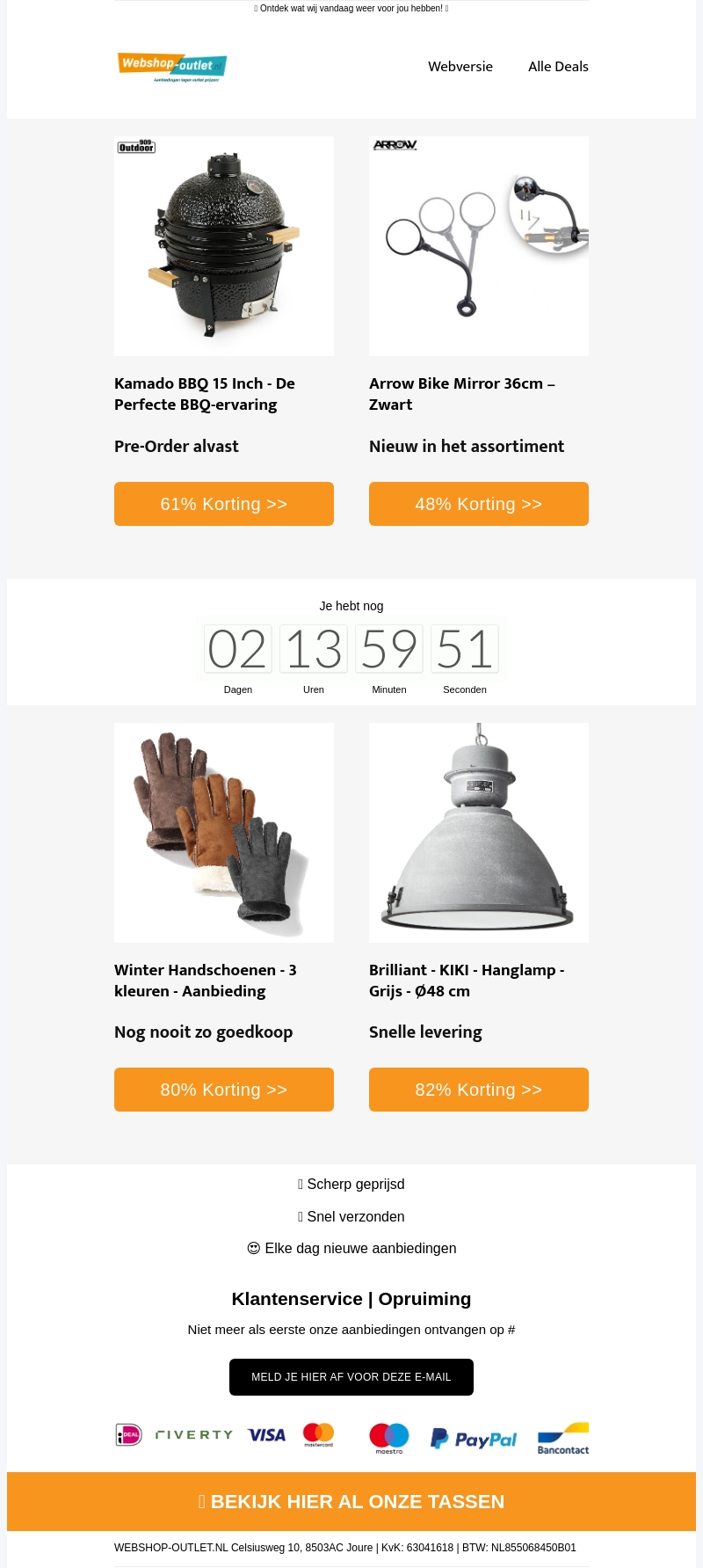 Mis deze geweldige deals niet! Pre-order de Kamado BBQ van 15 inch voor de ultieme grillervaring. Ontdek ook de nieuwe Arrow Fietsspiegel en nog veel meer met kortingen tot 82%. Geniet van scherpe prijzen en snelle levering op jouw favoriete artikelen.