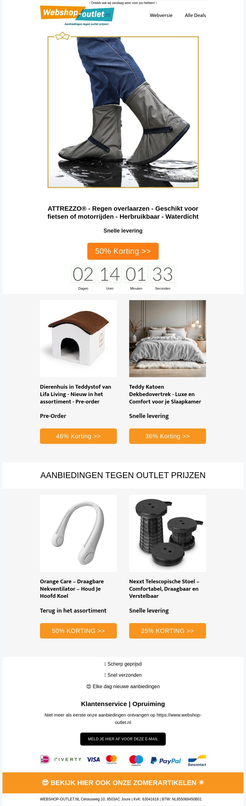Bekijk onze nieuwste aanbiedingen met kortingen tot wel 50%! Regenoverlaarzen voor de natte dagen, knusse dierenhuisjes in teddystof en comfortabele dekbedovertrekken. Daarnaast ook draagbare nekventilators en telescopische stoelen. Deze deals wil je niet missen!