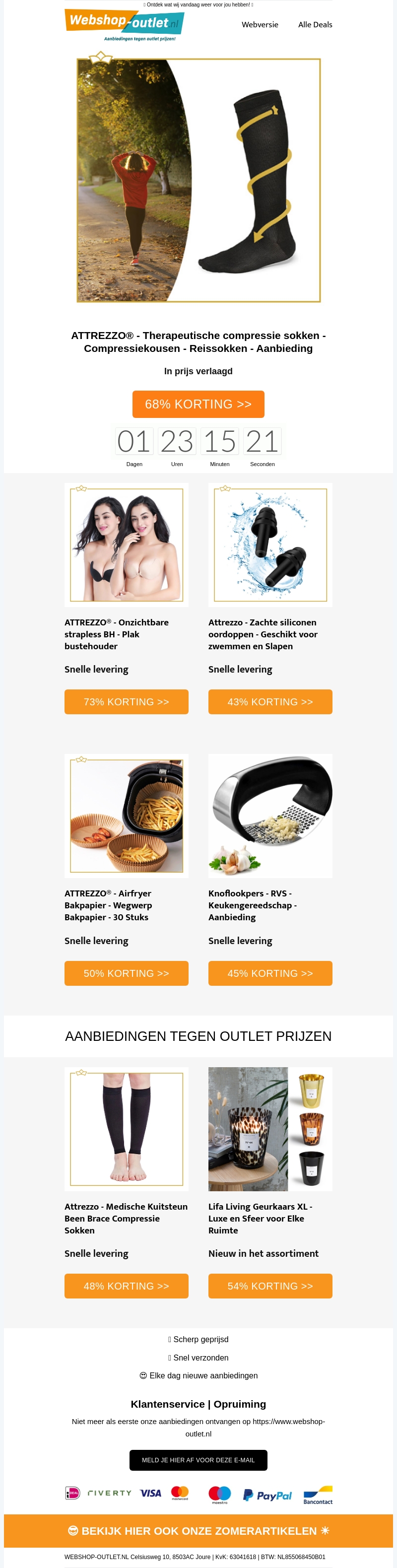 Verwen jezelf met onze speciale aanbiedingen op een breed scala aan producten, waaronder therapeutische compressiesokken, comfortabele oordoppen en luxe geurkaarsen. Met kortingen tot 73% is dit het moment om je favoriete artikelen in te slaan. Ontdek hoogwaardige items tegen outlet prijzen en geniet van snelle levering. Mis deze unieke deals niet en verbeter je lifestyle met onze producten!