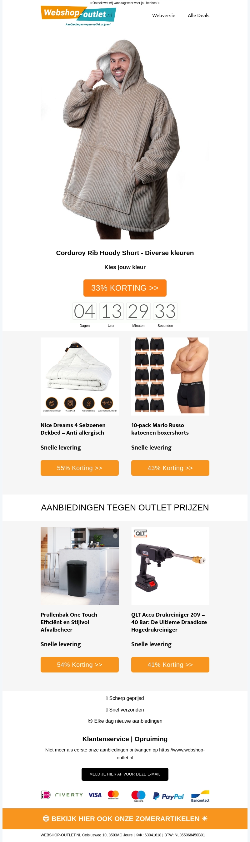 Verwen jezelf met geweldige kortingen op de Corduroy Rib Hoody, die beschikbaar is in diverse kleuren. Daarnaast biedt het Nice Dreams 4 Seizoenen Dekbed ultiem comfort in elk seizoen. Voor de modebewuste man zijn er Mario Russo boxershorts. Tot slot maken de Prullenbak One Touch en QLT Accu Drukreiniger je huishouden en tuin een stuk eenvoudiger.