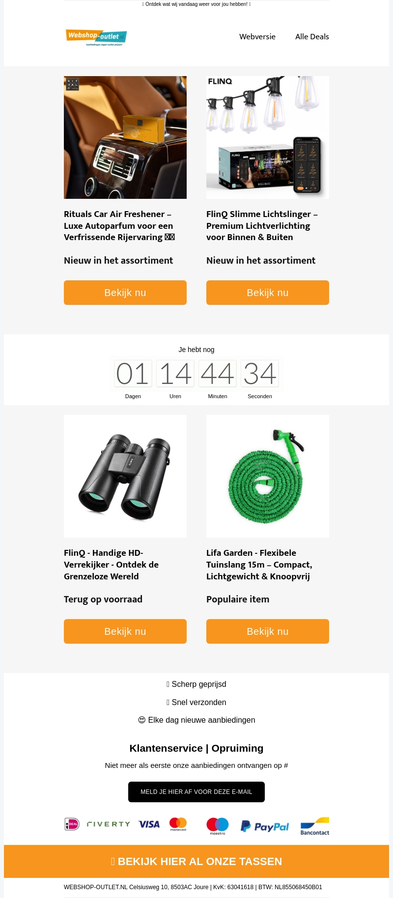 Verwen jezelf met de luxe Rituals autogeurtjes en geniet van slimme lichtslingers voor zowel binnen als buitengebruik. Ontdek de wereld met de handzame HD-verrekijker en houd je tuin netjes met de flexibele tuinslang. Shop nu bij Webshop Outlet voor unieke deals.