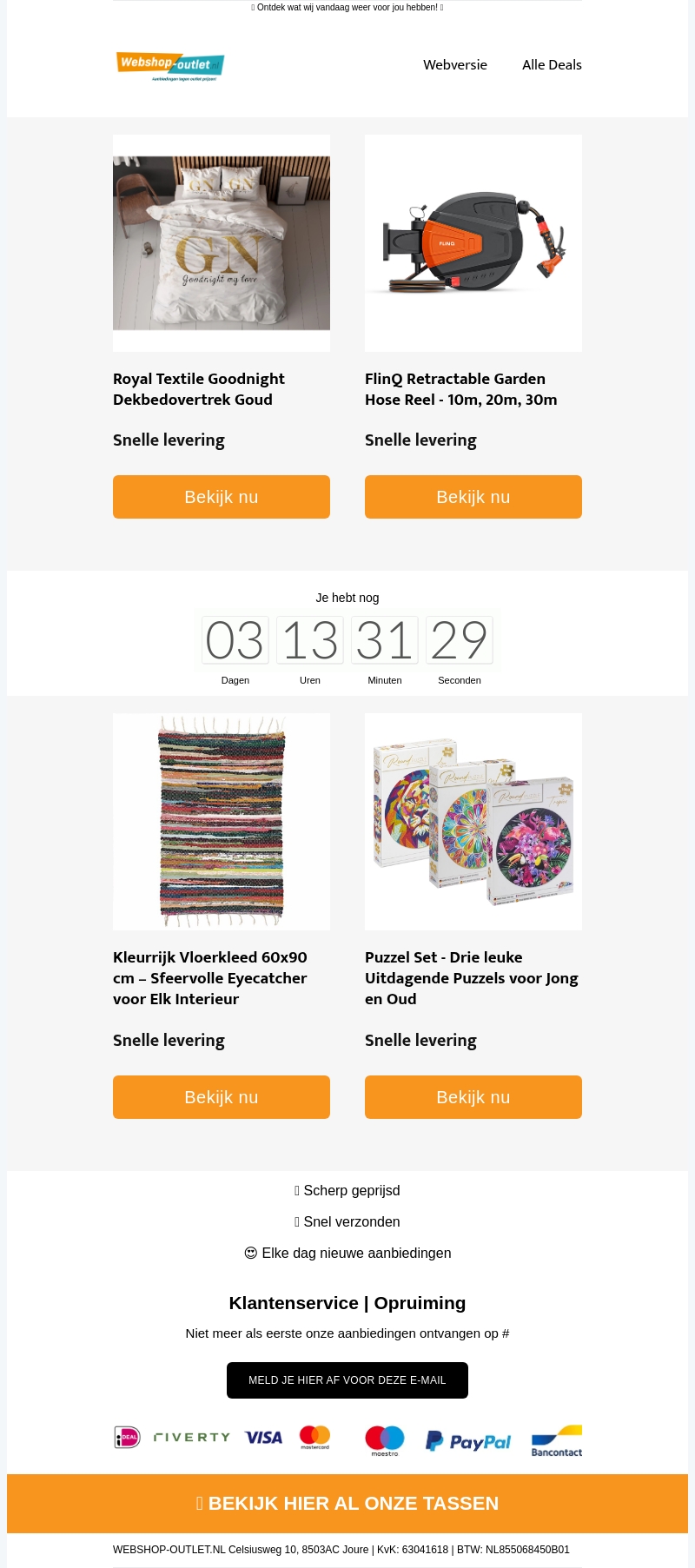 Vind de perfecte deals voor je huis en tuin bij Webshop Outlet. Geniet van luxe Royal Textile dekbedovertrekken, duurzame FlinQ tuinslangen, kleurrijke vloerkleden en uitdagende puzzelsets. Snel geleverd en scherp geprijsd! Mis deze exclusieve aanbiedingen niet.