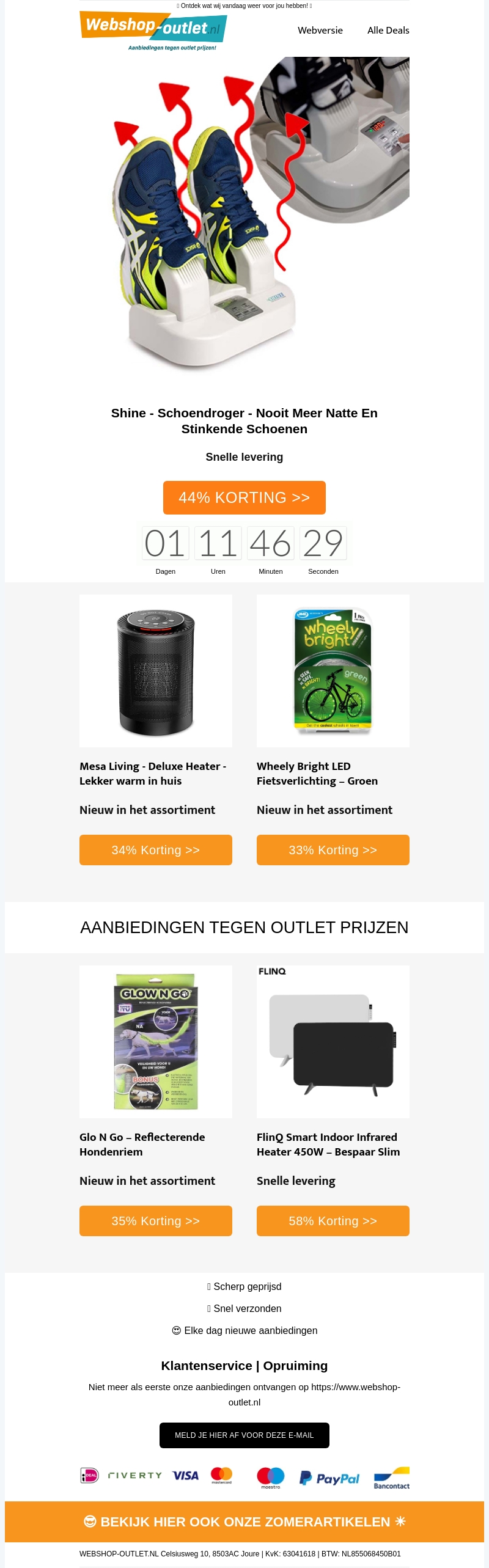 Profiteer van geweldige kortingen op diverse handige producten! Van schoendrogers voor droge en frisse schoenen tot innovatieve verwarmingen voor een warme woonkamer. Mis de kans niet om ook je fietsuitrusting te upgraden met Wheely Bright LED-verlichting. Er is zelfs een reflecterende hondenlijn om veilig te wandelen. Bezoek Webshop-outlet.nl voor de beste deals!