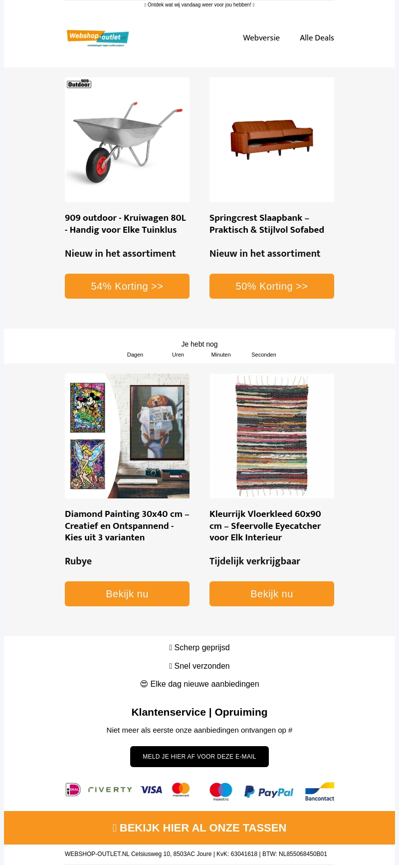 Verken onze nieuwsbrief voor geweldige aanbiedingen zoals de stijlvolle Springcrest slaapbank en de handige 909 outdoor kruiwagen. Profiteer van kortingen tot 54%! Ervaar creativiteit met onze Diamond Paintings of voeg kleur toe aan uw interieur met een vloerkleed. Mis deze exclusieve deals niet.