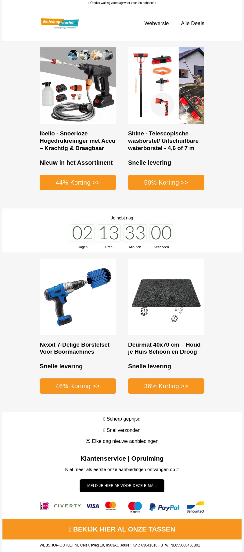Verken onze nieuwste collectie van snoerloze hogedrukreinigers en veelzijdige borstelsets. Ideaal voor een schone en georganiseerde leefomgeving. Profiteer van kortingen tot wel 50% op geselecteerde items. Snelle levering en topkwaliteit zijn gegarandeerd. Mis het niet!