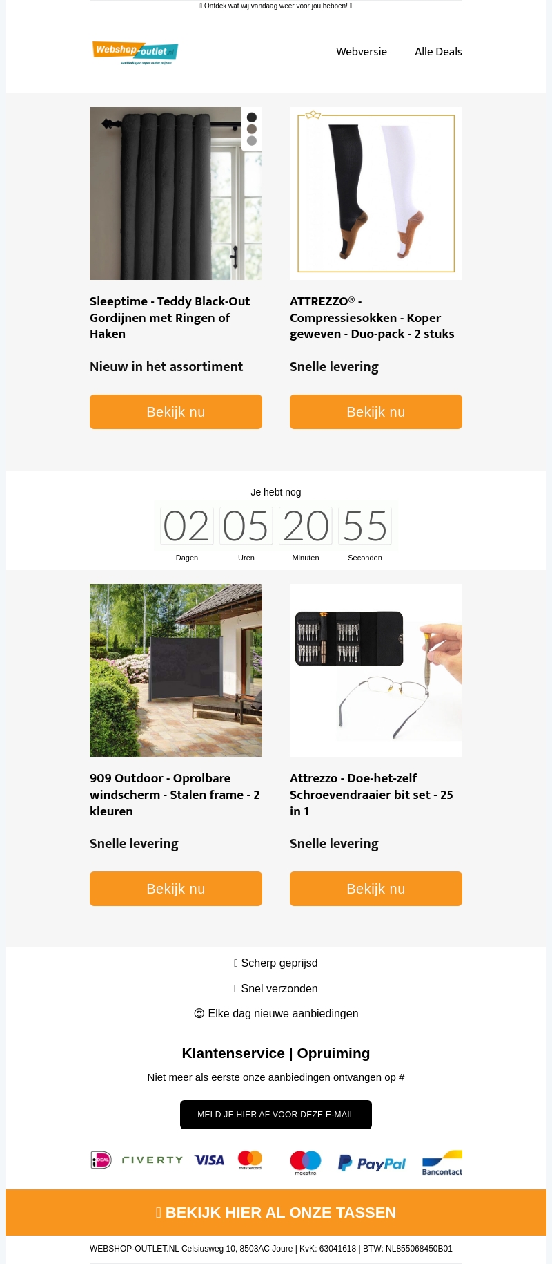 Blijf up-to-date met onze nieuwste assortiment! Verken de luxe Teddy Black-Out Gordijnen voor perfecte verduistering. Zorg voor jezelf met onze koperen compressie sokken. Voor buitenliefhebbers zijn er oprolbare windschermen. En handig voor iedereen: onze complete schroevendraaierset.